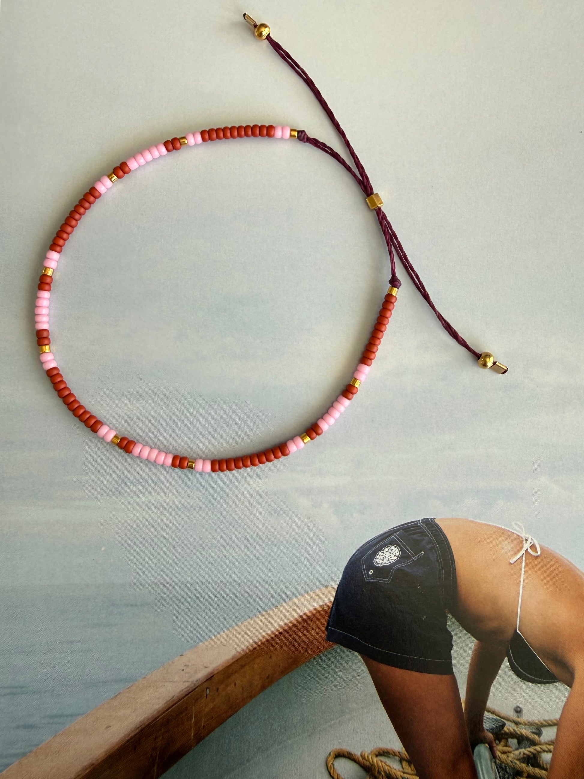 A cheeky mix of burgundy and pink beads with subtle gold accents ~ bold yet sweet. Designed to be worn every day, layered or solo, and never taken off.