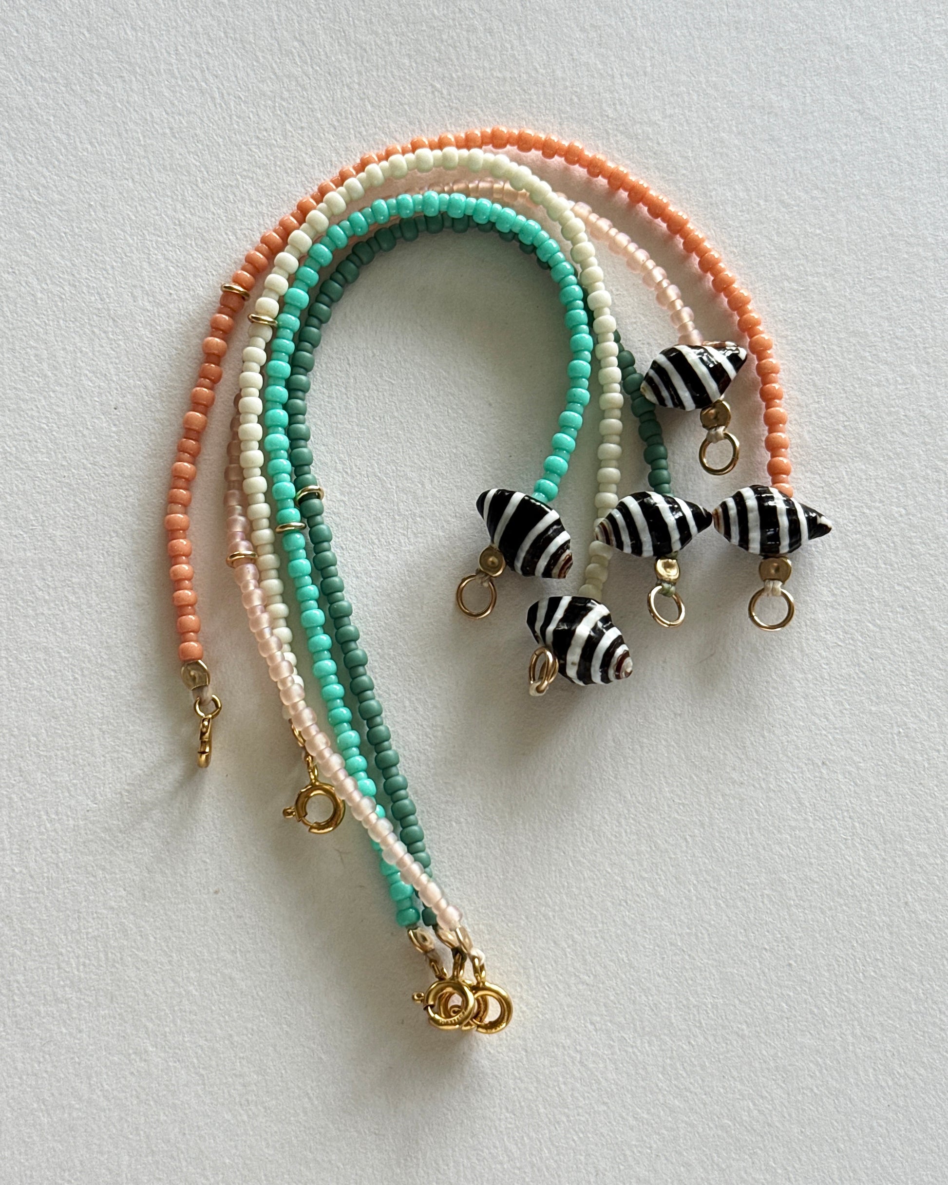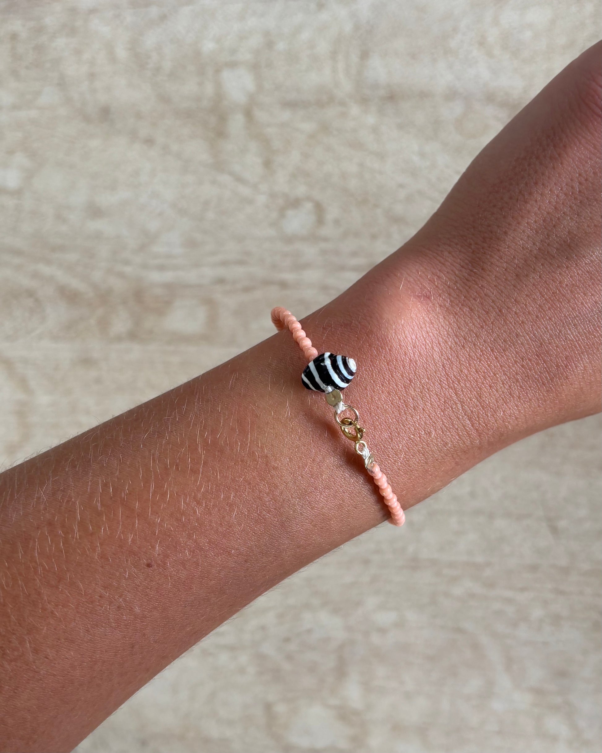 Inspired by the gentle patterns of the Nerite shell, this bracelet carries a little piece of the ocean wherever you go. Each one is hand-strung in our beachside studio with soft beads and a naturally striped shell ~ a simple reminder of slow days by the sea.