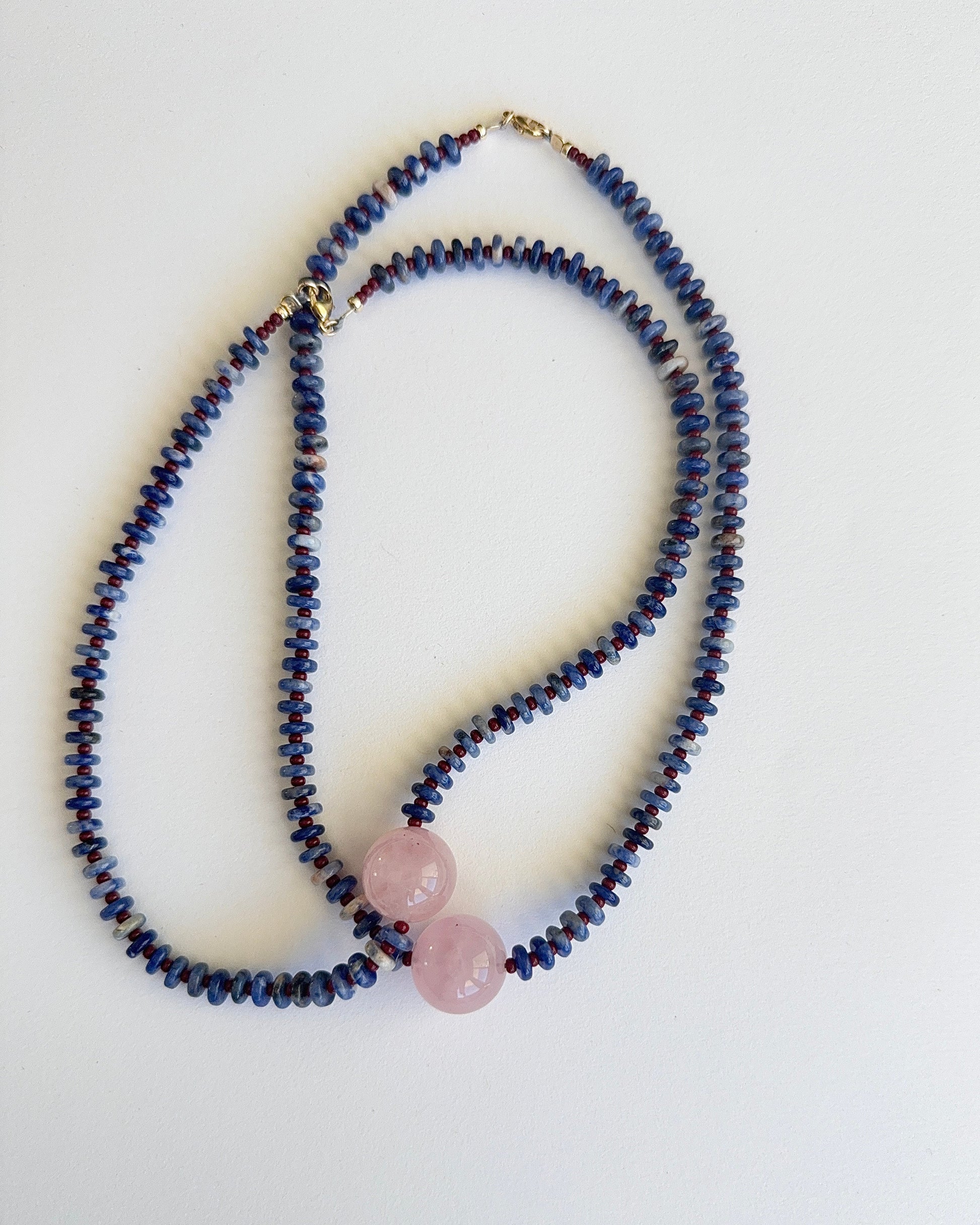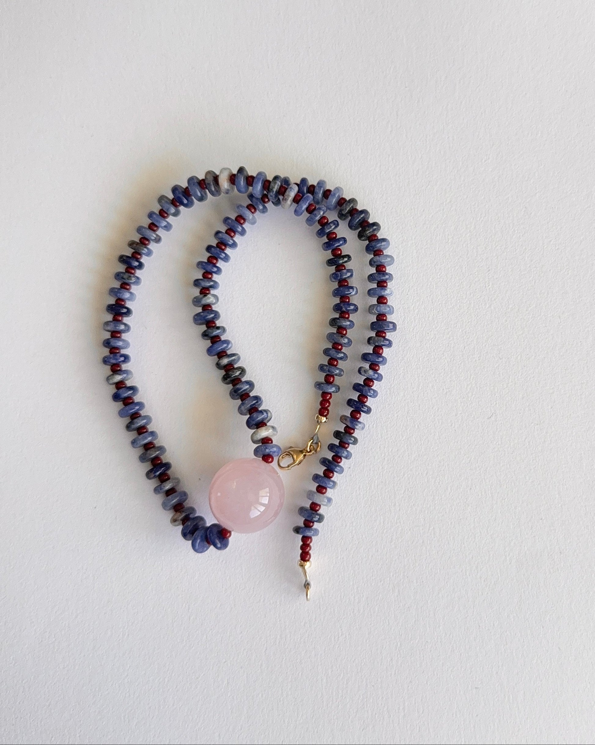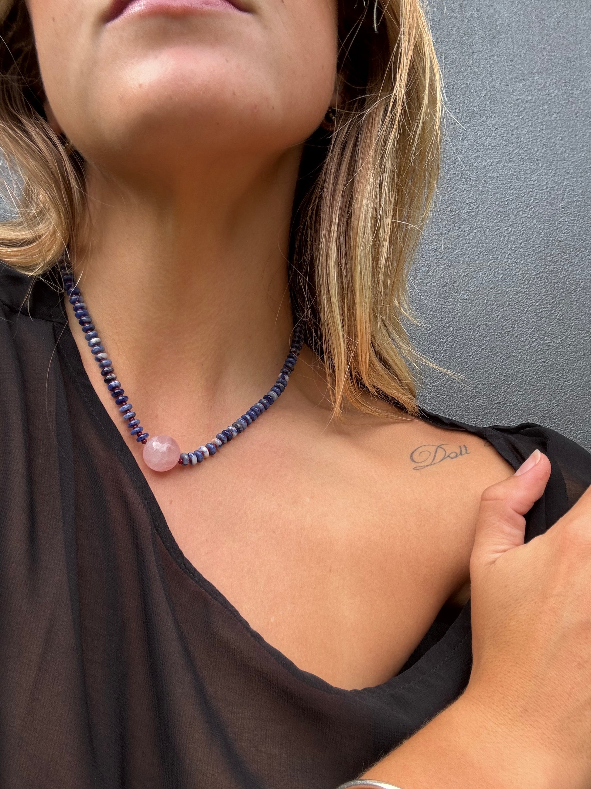 Lapis disc beads featuring a rose quartz focal sphere, necklace.