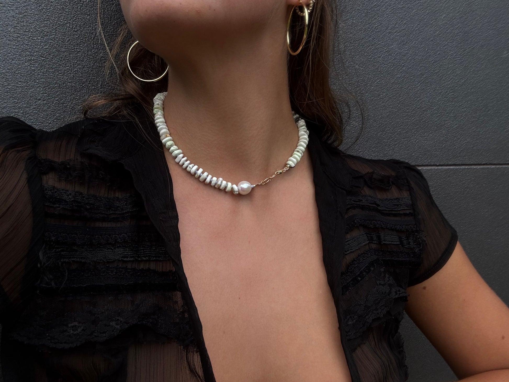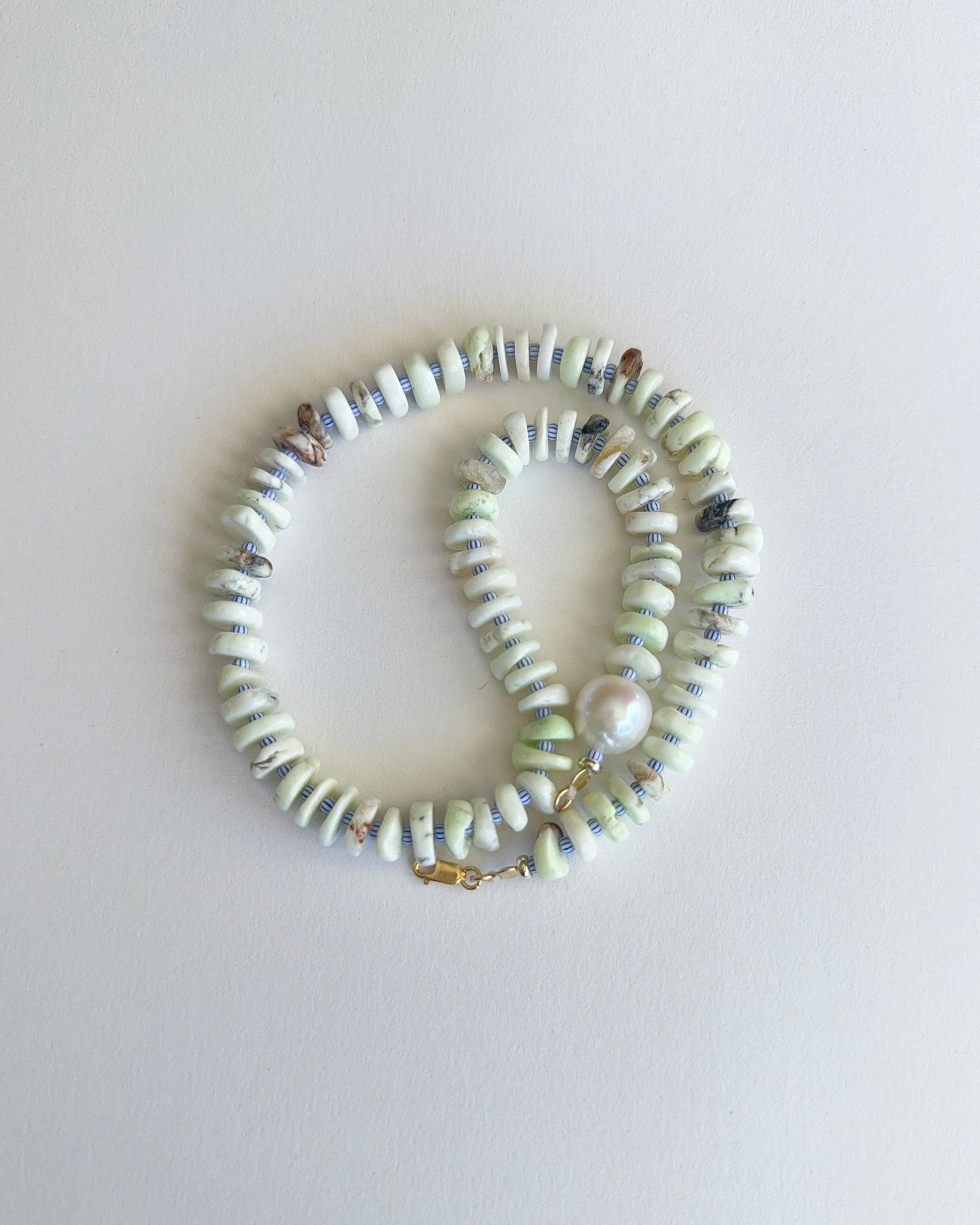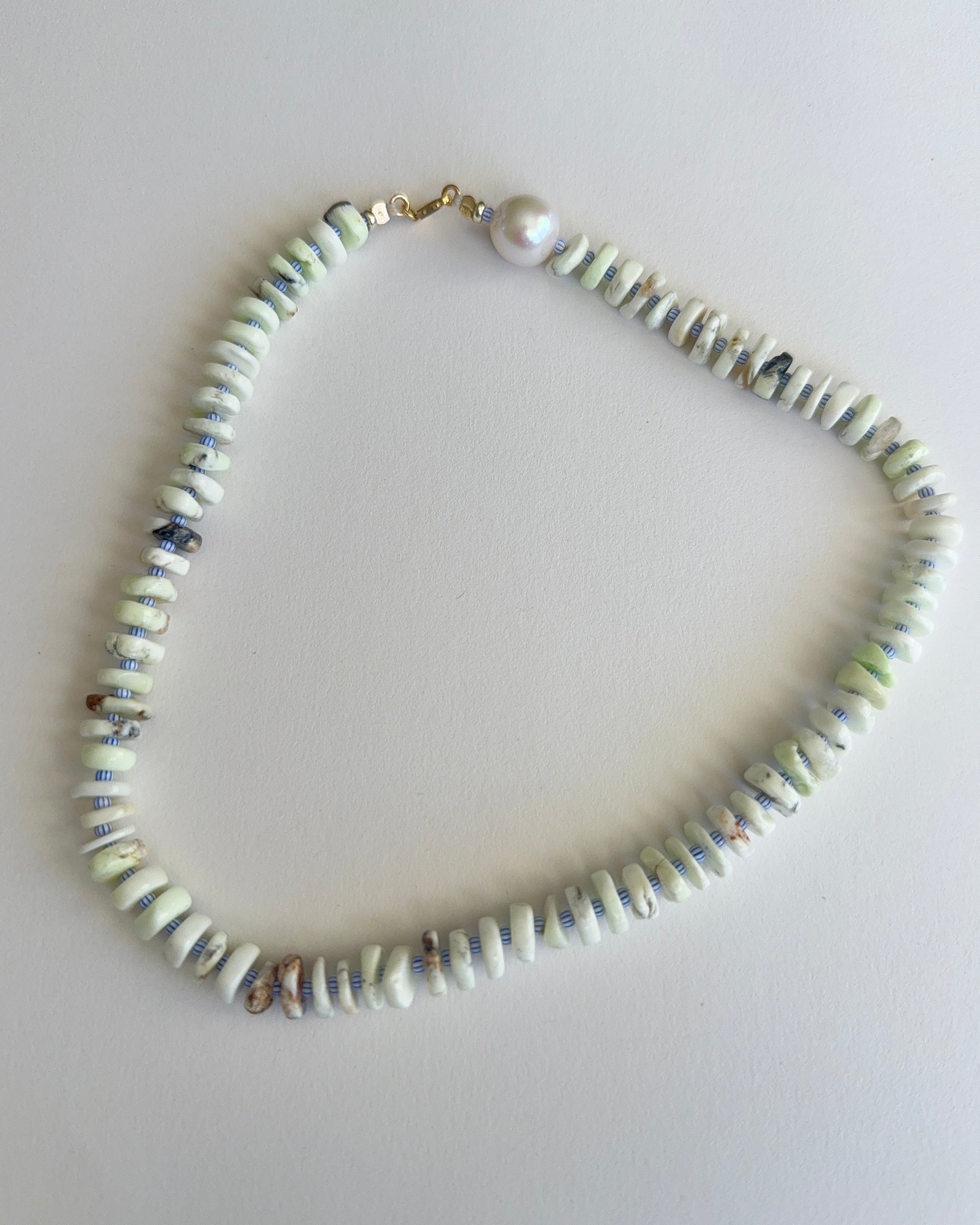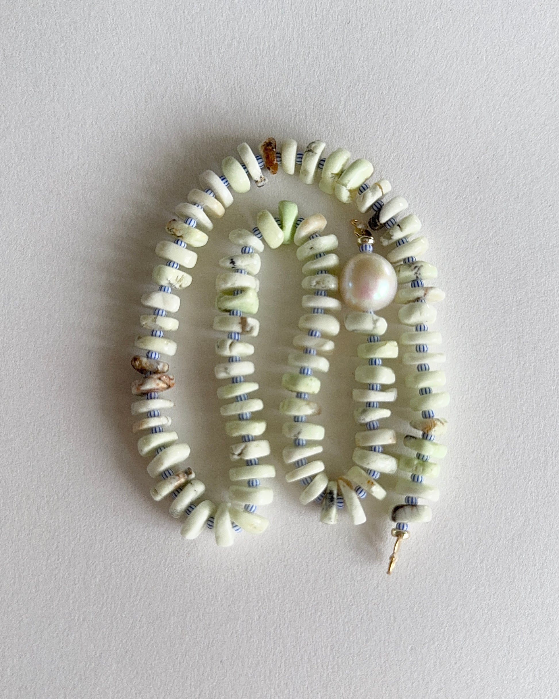 Gaspeite & blue stripe seed beads , featuring a single freshwater pearl necklace.