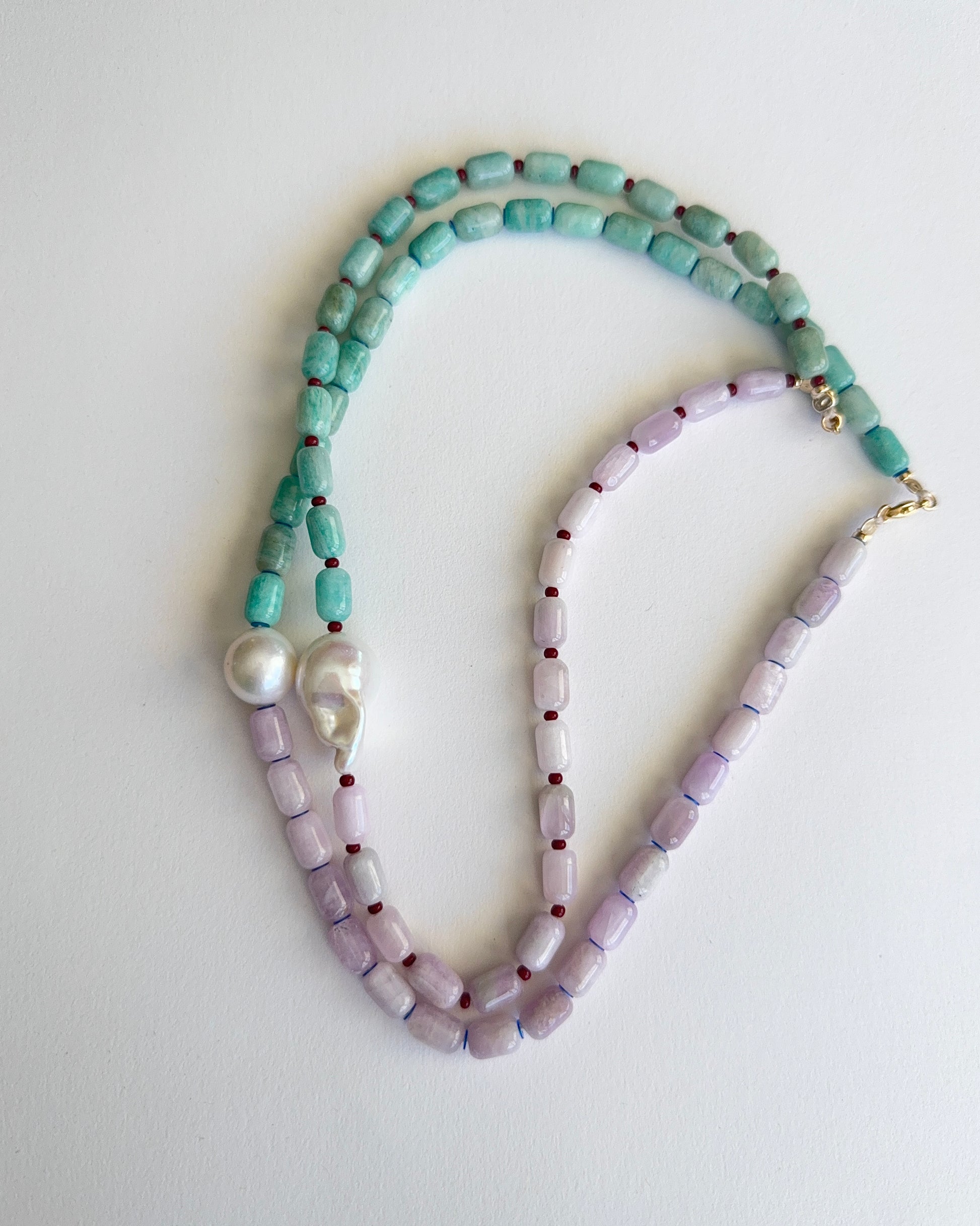 Kunzite + amazonite gemstone beads featuring a baroque or round freshwater pearl highlight necklace.