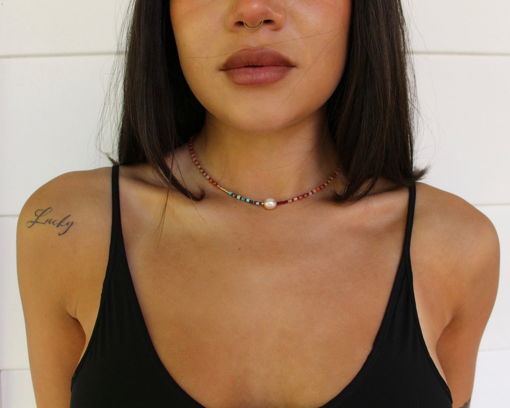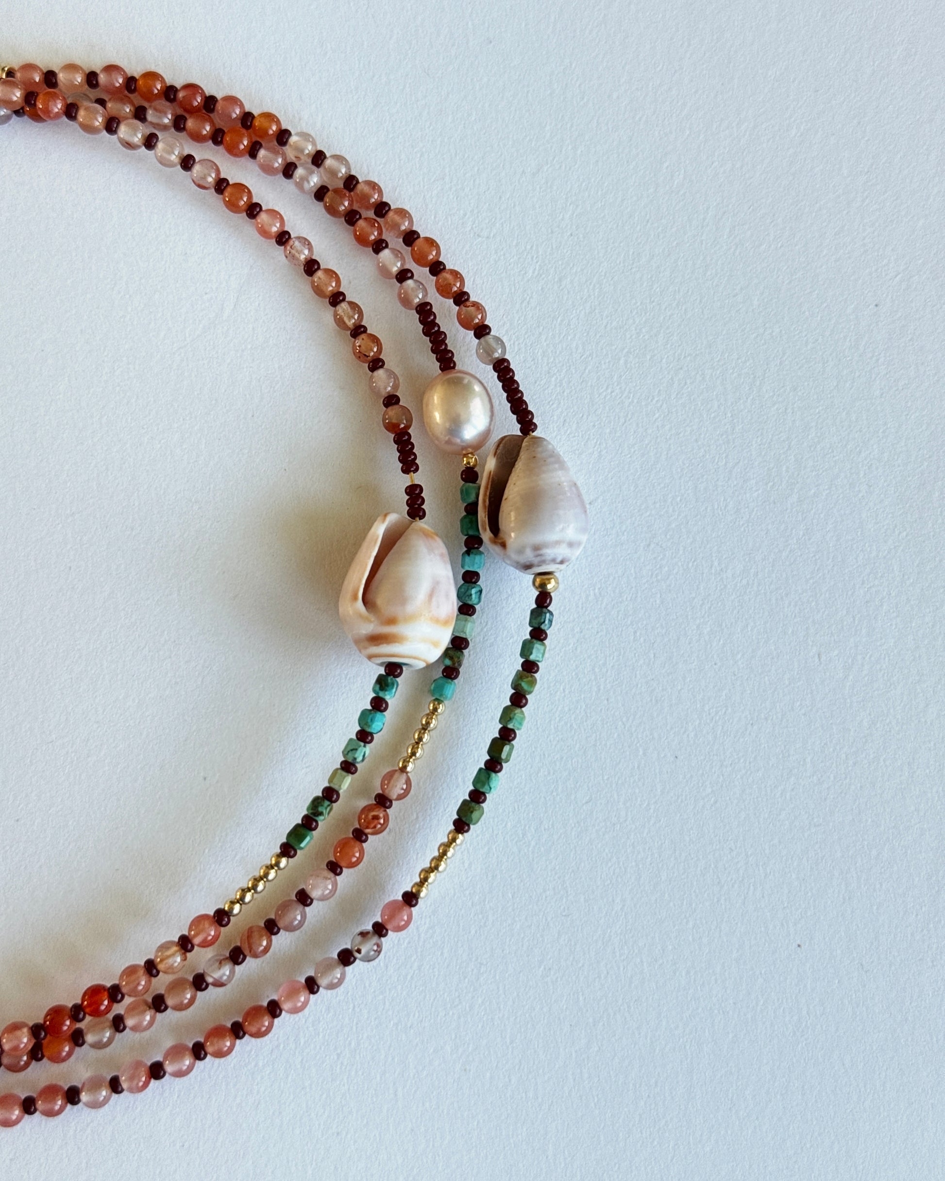 A duo of delicate strands designed to be worn together or solo. One features a luminous pearl, the other a natural shell ~ both surrounded by a rich mix of agate, turquoise and gold accents.